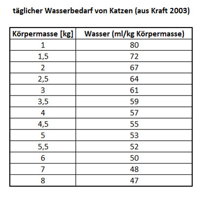 Die Katzen wogen im Durchschnitt 3 kg (+-0,6). Für die Tiere mit diesem Gewicht gilt beim Wasserbedarf ein Richtwert von 81 ml/kg oder also 183 ml am Tag.